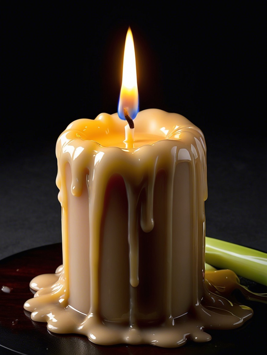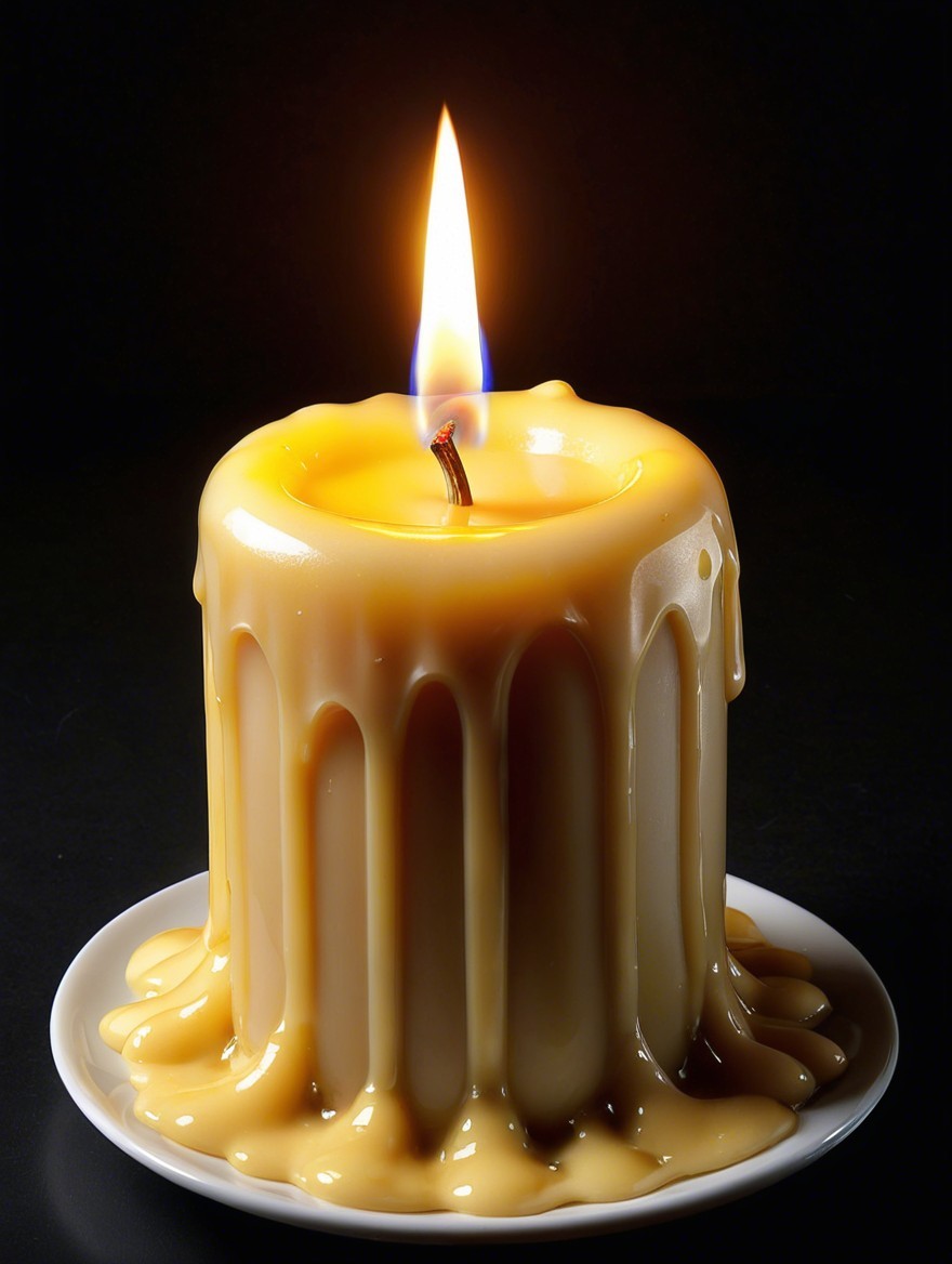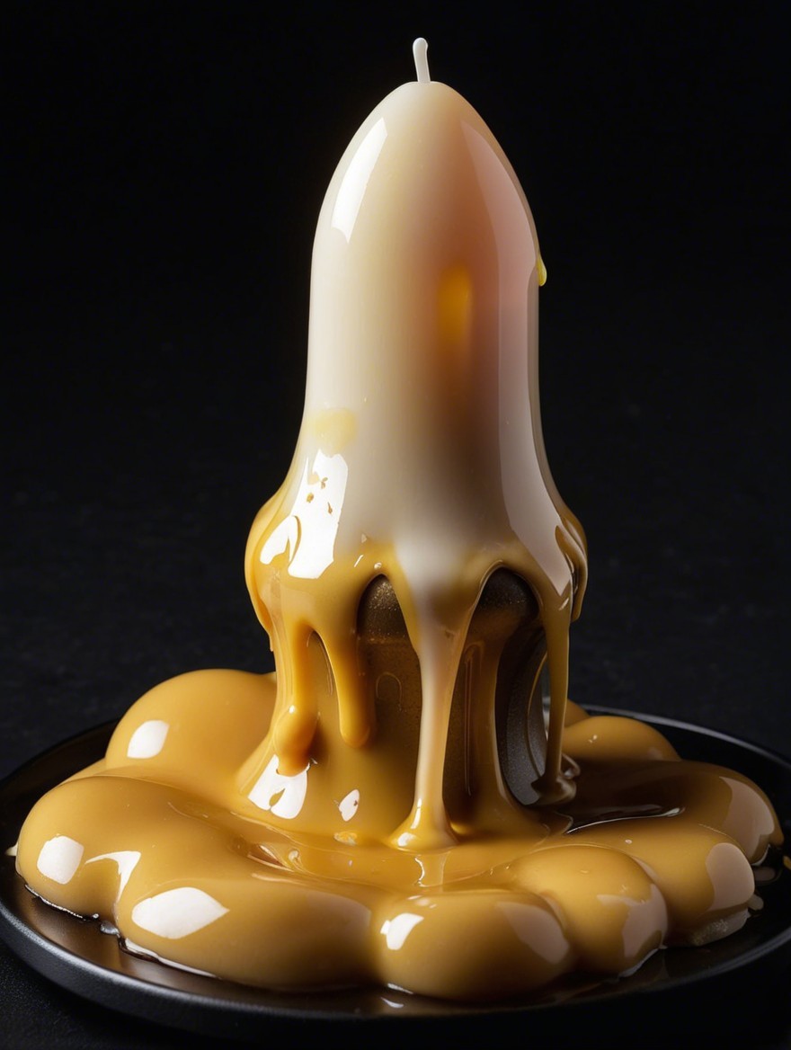 A whimsical dessert features a cone topped with creamy, dripping vanilla-like ice cream, oozing golden syrup, creating an inviting yet surreal appearance against a dark background.
