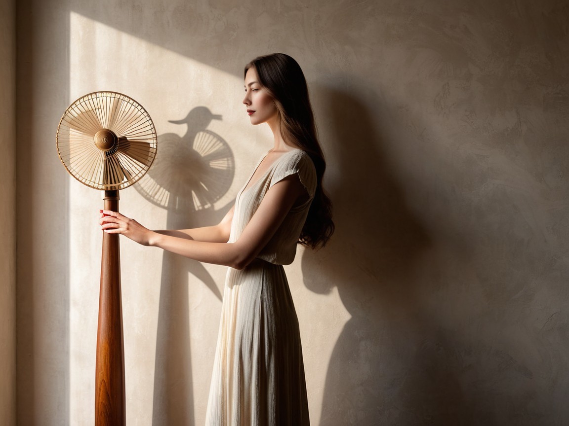 A young woman stands near a vintage fan, bathed in soft light. Her flowing dress complements the serene atmosphere, with gentle shadows casting an artistic touch on the wall.
