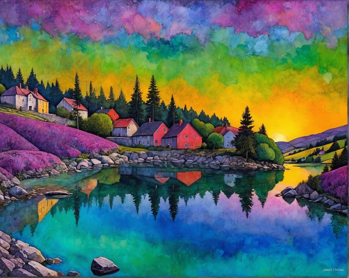 A vibrant watercolor scene depicts a serene coastal village with colorful houses nestled against a backdrop of lush trees and mountains, reflecting beautifully in the tranquil waters at sunset.