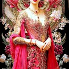 A stunning woman in an ornate red gown adorned with feathers and intricate floral patterns. Her hair cascades beautifully, and she wears sparkling jewels, framed by an elegant circular design.