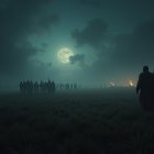 In a misty landscape under a full moon, a lone figure walks towards a distant group of shadowy warriors, their silhouettes illuminated by a faint glow, creating a haunting, atmospheric scene.