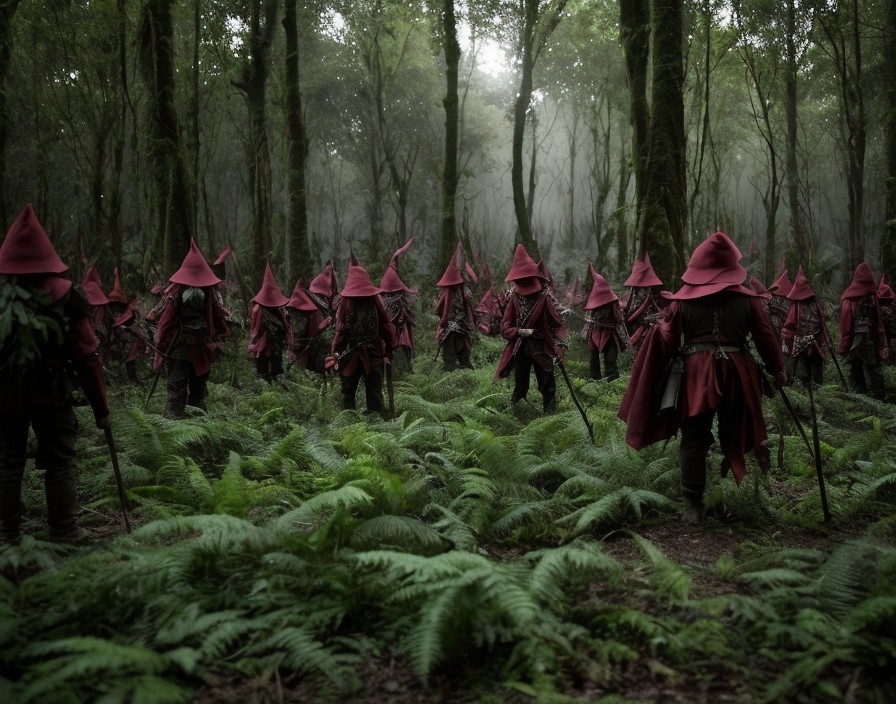 A group of robed figures in red cloaks walking through a moonlit forest.
