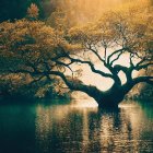 A mystical scene featuring a large, twisting tree beside a tranquil sea. A charming cottage and a ship are visible under a glowing full moon, creating a dreamlike atmosphere.