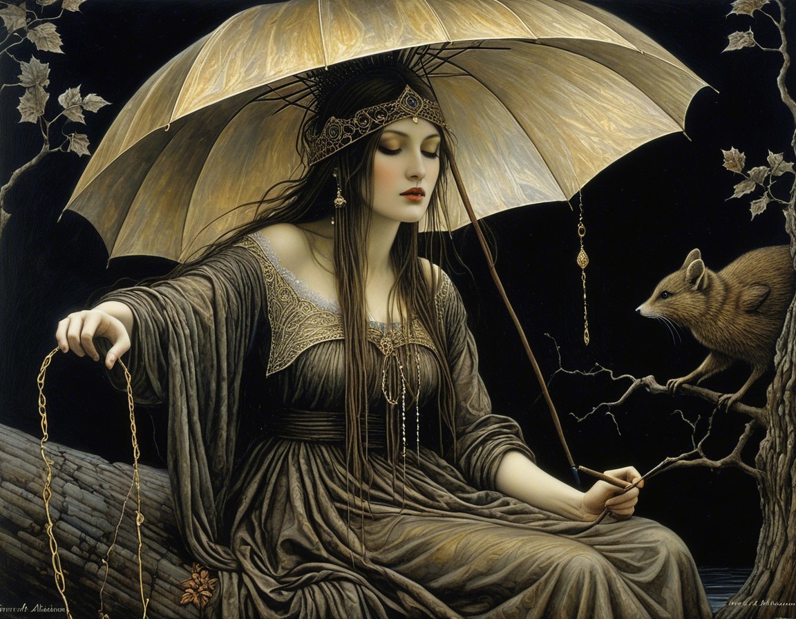 A serene figure sits under an ornate parasol, delicately holding a quill. She is surrounded by dark trees, with an elegant piano beside her, creating a mystical and introspective atmosphere.
