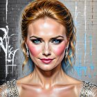A striking portrait of a woman with red hair and bold red lips, set against a geometric blue and white background. Her expressive eyes and soft features convey elegance and confidence.