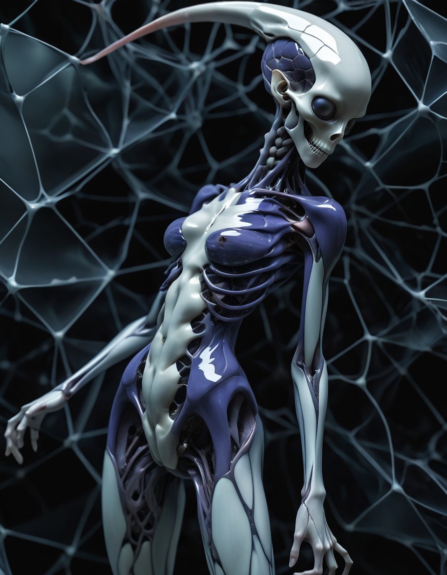 Prompt: Non Planar Voronoi as Spatial Form From Despair, in Transfer & Emulsion Voronoi Lifts of Secret 814-884 anti-gravity superweapon Evangelion Unit NEWBORN_XENOMORPH 01 depicted as vertical translucent final image distorting optical glitch anomalies of databending of cracked analog errors and visual and auditory effects of a tintype inspired portrait, no cut off, wrapped trapped bubbles in cracked glass negative extreme erroneous subsurface scattering art - This is absolutely glorious watercolor in glass { in a thin stretched enveloping aluminium/latex membrane - Peppa pig BDSM Abstractionism Art Draperie Patchwork }. Undeniable emotion in this piece by Hieronymus Bosch with Francisco Goya and Michael Hussar and Cameron Gray and Zdzislaw Beksinski - Optical Float Paintings Suspended in Layers of Glass