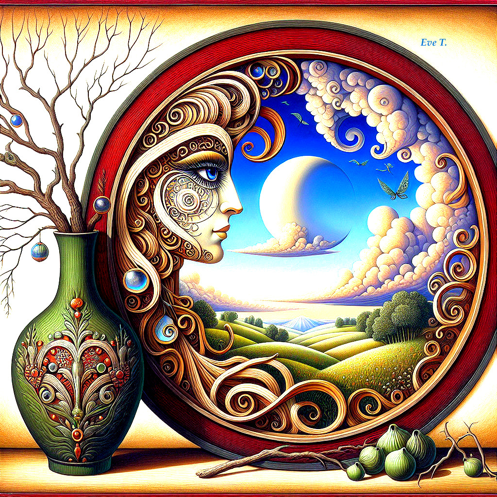 The artwork features a woman's profile surrounded by swirls of clouds, a vibrant landscape, and a decorative vase, blending nature and human form in a surreal, colorful style.