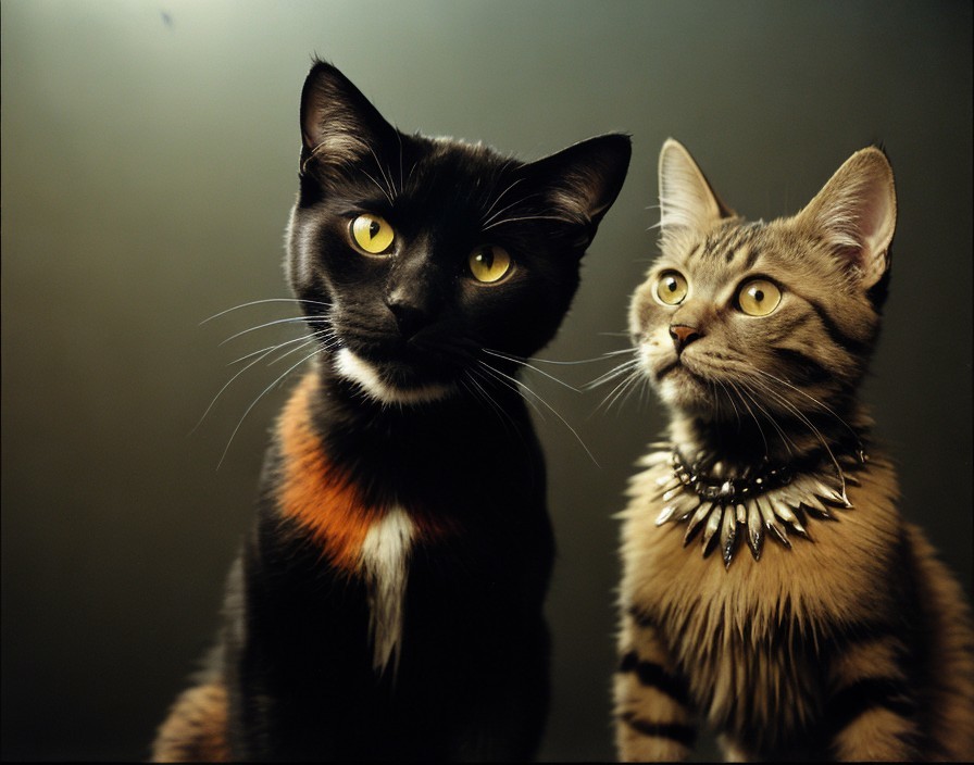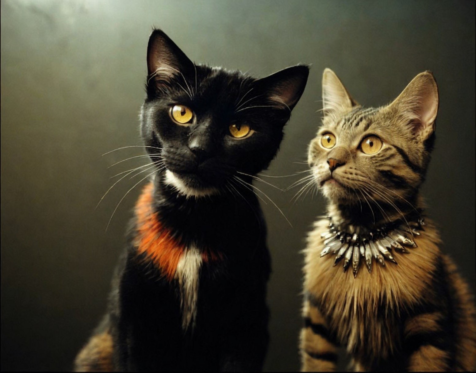 (Try it from By Deception) - Two cats with striking eyes—one black with orange patches, the other striped—pose side by side against a dark background.