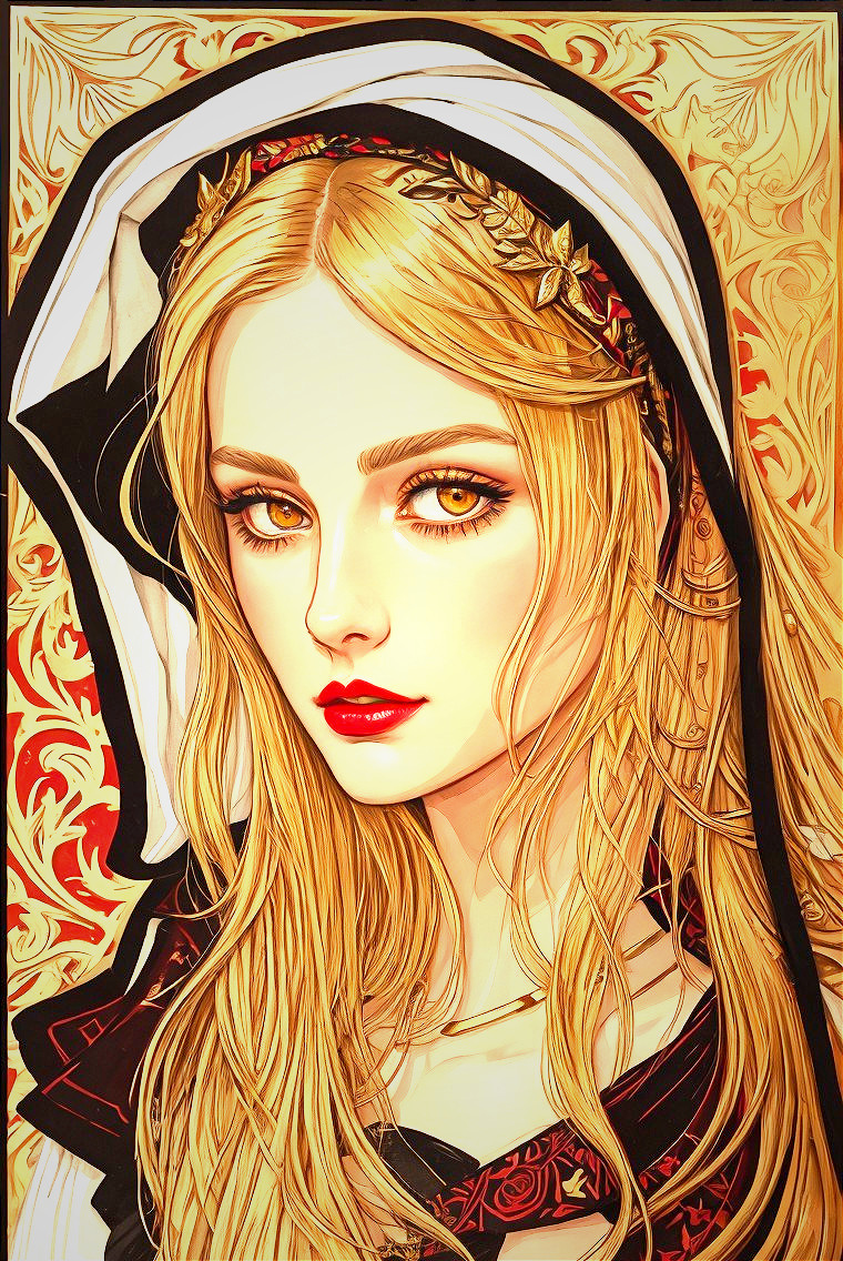 Stylized portraiture, linocut, detailed cuts with Watercolor and ink intertwined with zentanglelines, , beautiful pre-raphaelite woman with long blonde hair and white headscarf, detailed devilish eyes, background in watercolor and ink, stylyzed details, dark red lips, vibrant colors with gold foil detail, brown eyes, 3d effects 1.8, highly detailed, spiritual essence, fine streaks, particles, dreamy, soft edges, dynamic pose, style of Amanda Clark, Margaret Keane, Susan eakins, Arthur rackham, William timlin, Arlie Opal, Overton Loyd, perfect handsface, tints of dry brushed painting, brushed textures 1.7, detailed brushed background ,hues, grain, Schreger lines 1.7, joy, blurry aura, soft edges, strict, hazy, eerie, occult, impasto flares, anisotropic filtering 1.7, raytraced shadows 1.8, chiaroscuro lighting, ethereal, abstract, coherent, fauvistic, synthetic, occult, Anglocore 1.9, american gothic 1.7, intricate stylized illustration 1.8, tints of Bob Eggleton, brightness 1.4, very stylized illustration, complexion 0.7, finest strokes, encaustic,