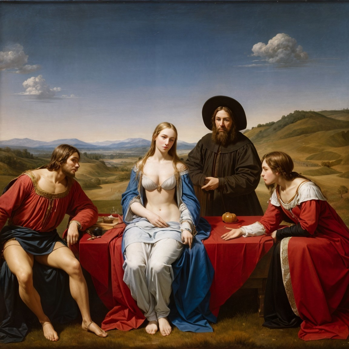 A classic painting depicts a woman in blue and white, flanked by three individuals in period clothes against a pastoral backdrop.
