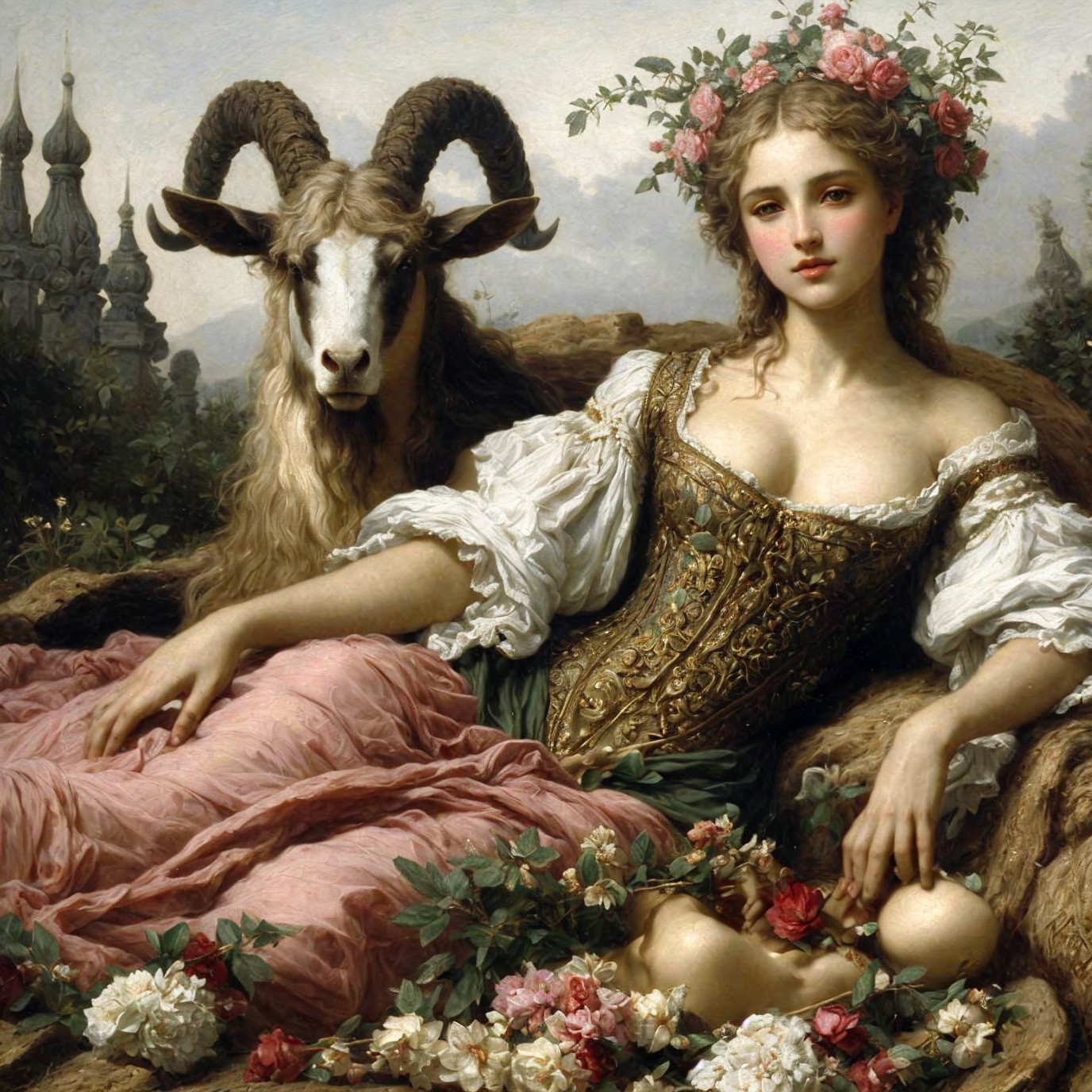 Draped in fine silks and luxurious fabrics, the maiden embodies elegance and sophistication. Beside her, a large pet billy goat maintains a vigilant presence, enhancing the enchanting atmosphere. The goat, always at attention, adds a touch of mythical