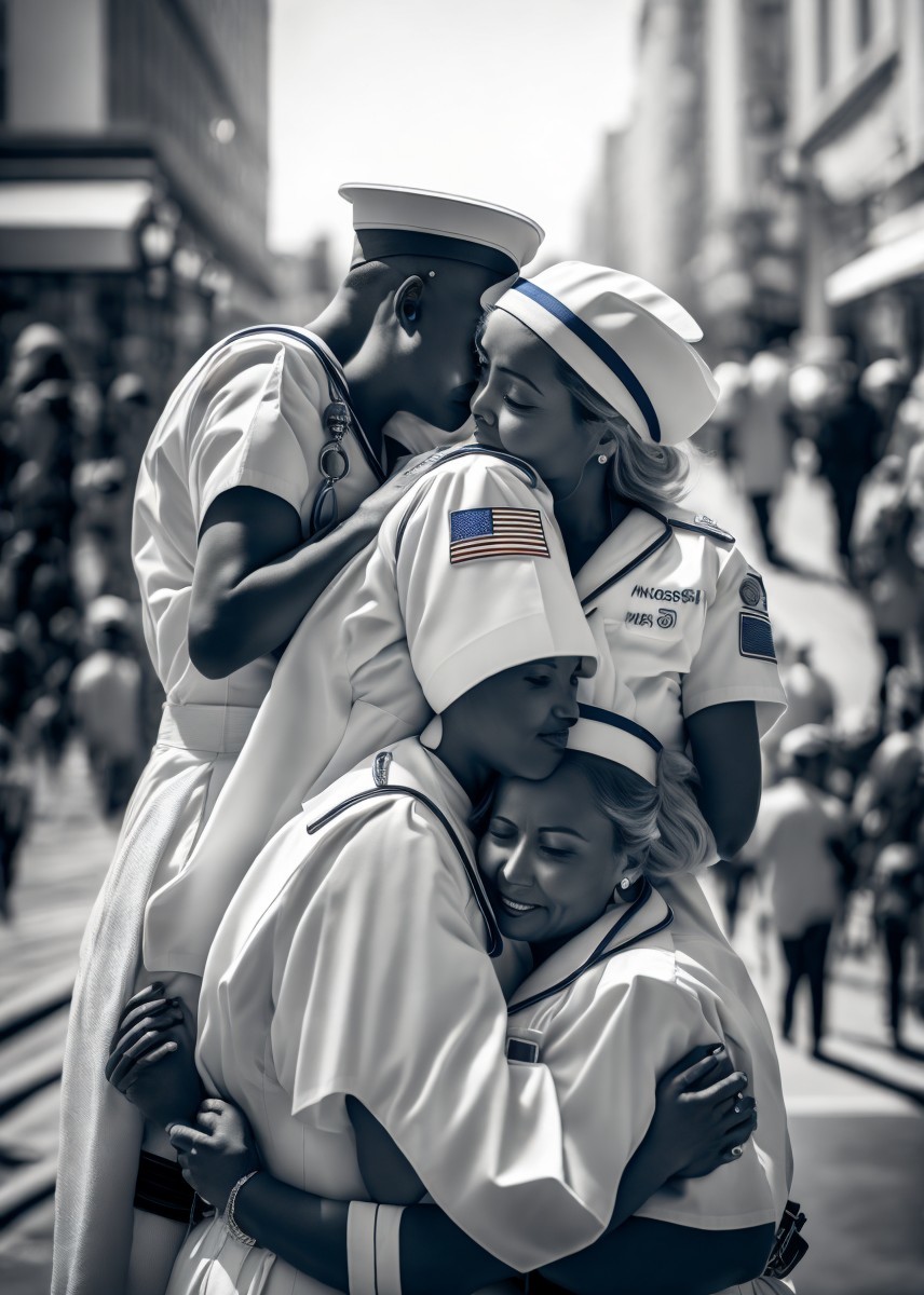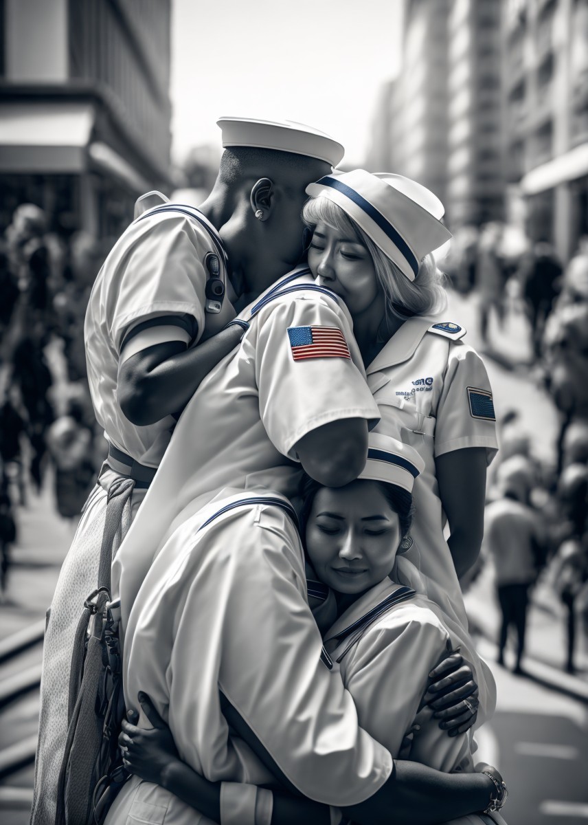 A monochrome image captures a tender family embrace with sailors kissing, as a child hugs them, amidst a bustling street.