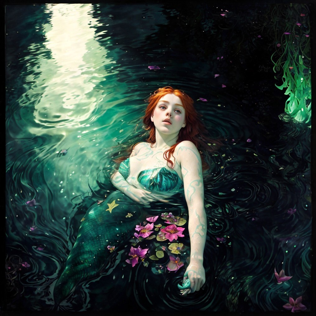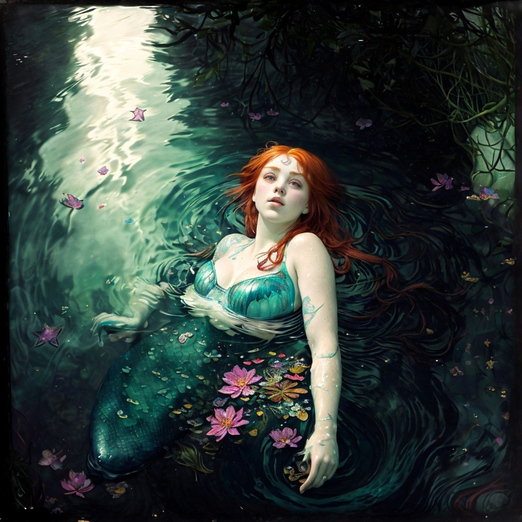 A red-headed mermaid with green tail floats amidst water lilies in a serene, dark water setting.