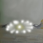 A surreal landscape features misty mountains in the background and an abstract flower-like formation of glowing orbs. The atmosphere is ethereal, with soft colors and a calm, dreamlike quality.