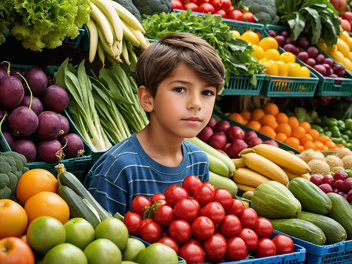 A little boy with dark brown hair and brown eyes looks directly at the camera, his face partially obscured by various fresh produce, including bright red tomatoes, green grape-like fruits, oranges, and green apples, all arranged in crates at a market or stand. He wears a blue and white striped shirt