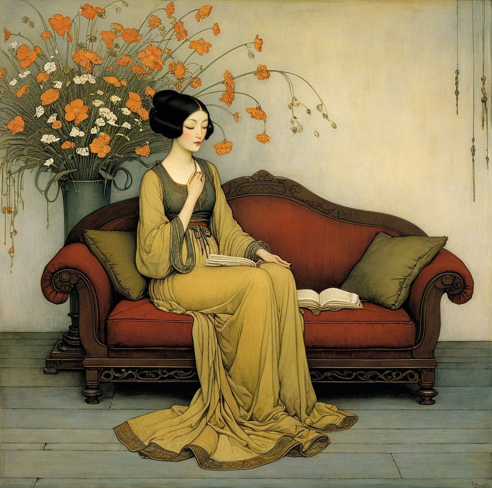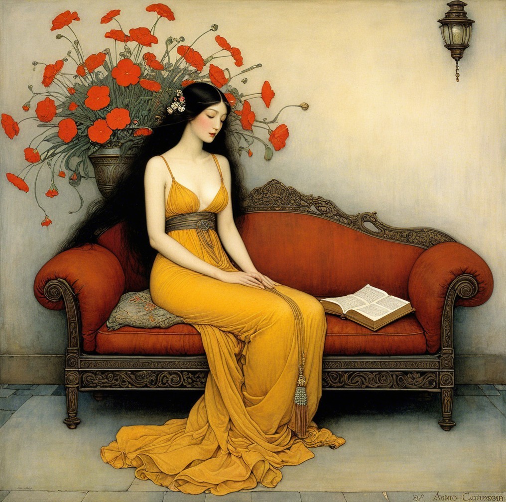 A serene woman in a flowing yellow gown sits on an ornate red couch. Her long dark hair cascades around her, complemented by a decorative headpiece against a dreamy, soft background.