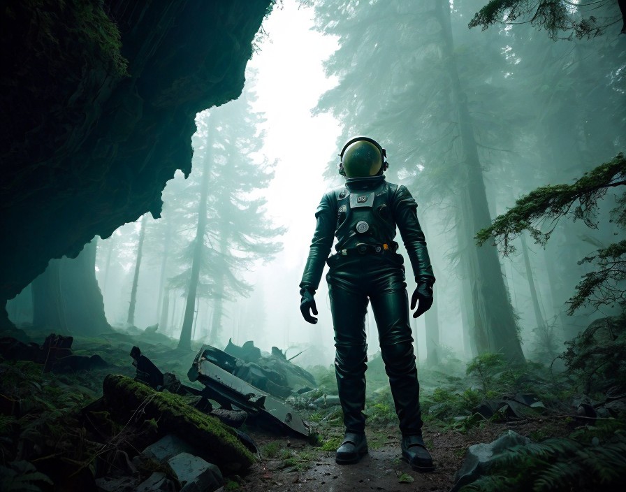 Space Explorer Investigating An abandoned decaying giant robot wreck in a green forest on a strange planet, half underground, covered in rocks and plants, Saturn rising, space exploration, retrofuturistic, retrofuturism, vintage, monochromatic photography, space suit, vintage, look of the 1950s