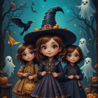 Three young girls dressed as witches stand in a spooky forest under a full moon. They're wearing black dresses and pointy hats, surrounded by bats, ravens, and carved pumpkins.