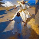 + Prompt:Mystic Jesus create an image using the language of symbolism an image of how Jesus would look as an Angel with Chaotic Good White Feathered Short Warrior Angel Wings standing in the morning light as his shadow reflects His True Image.