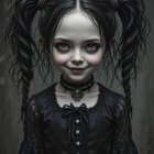 A whimsical doll with curly red hair and striking green eyes stands in a misty forest. Dressed in a black outfit adorned with lace, she exudes a charming, vintage vibe.