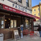 Bustling Street Scene at Vintage Sicilian Pizzeria