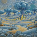 A surreal landscape features towering, mushroom-like trees with vibrant colors, rolling hills in shades of purple and teal, and a winding golden path weaving through the fantastical scenery.