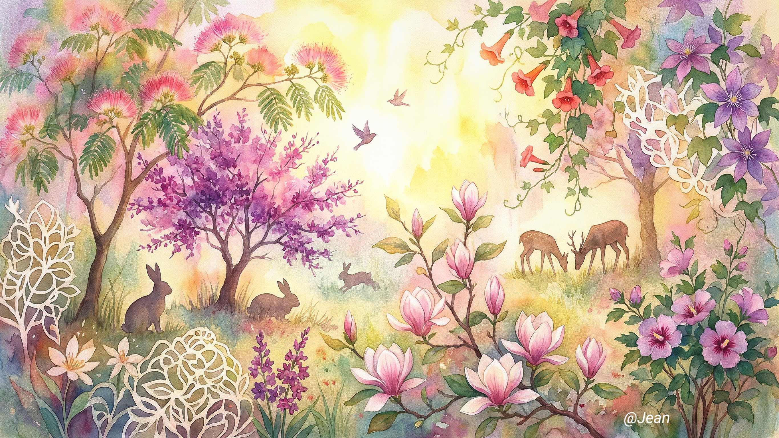 A wide watercolor painting of a dreamy, magical woodland scene bursting with spring and summer flora, bathed in a soft, bright yellow glow from above. The scene features lush trees with pink powder-puff flowers and purple blossoms, alongside branches adorned with large pink magnolias and smaller purple hyssop-