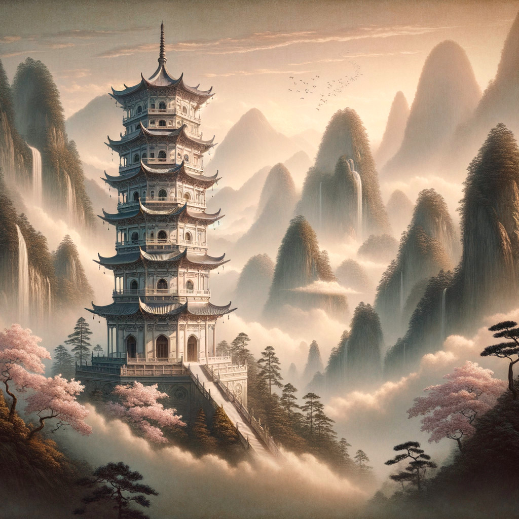 A majestic pagoda stands atop a mountain, surrounded by misty peaks and lush greenery, bathed in warm sunlight. The serene landscape radiates tranquility and ancient charm.