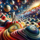 An astronaut stands amidst a vibrant swirl of colors and celestial bodies, surrounded by a cosmic landscape of planets and star-filled skies, evoking a sense of wonder and exploration.