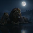 A majestic lion and lioness sit by a serene waterhole beneath a full moon, surrounded by ethereal mist and silhouettes of acacia trees on a tranquil savanna landscape.