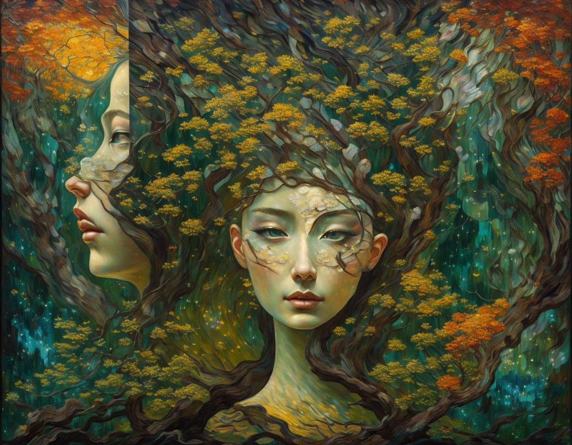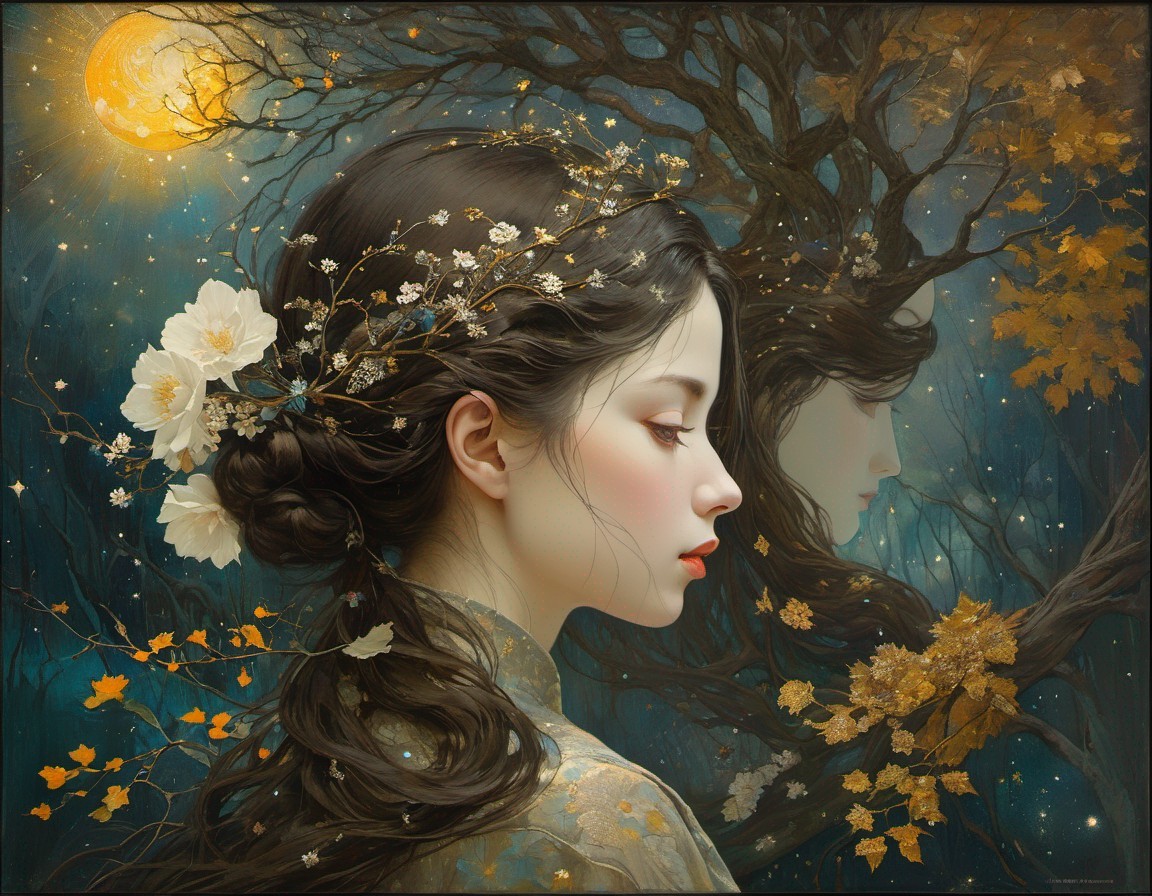 Female portrait painting in profile, pasty tempera on old worn canvas, beautiful mind journey. By Christoffer Relander, Dan Mountford, Van Gogh, Yossi Kotler, Klimt, Victo Ngai, Naoto Hattori. Amazing multiple exposure optical illusion, mixed media, surrealism, otherworldly. Impressive old trees, vines, roots, starry night sky, mountains, rivers, in the clouds, storybook illustration, by Susanne, landscape portrait, perfect face, enigmatic, dreamlike, beautiful lighting, beautiful vibrant colors, ultra detailed seamless blending of two scenes.