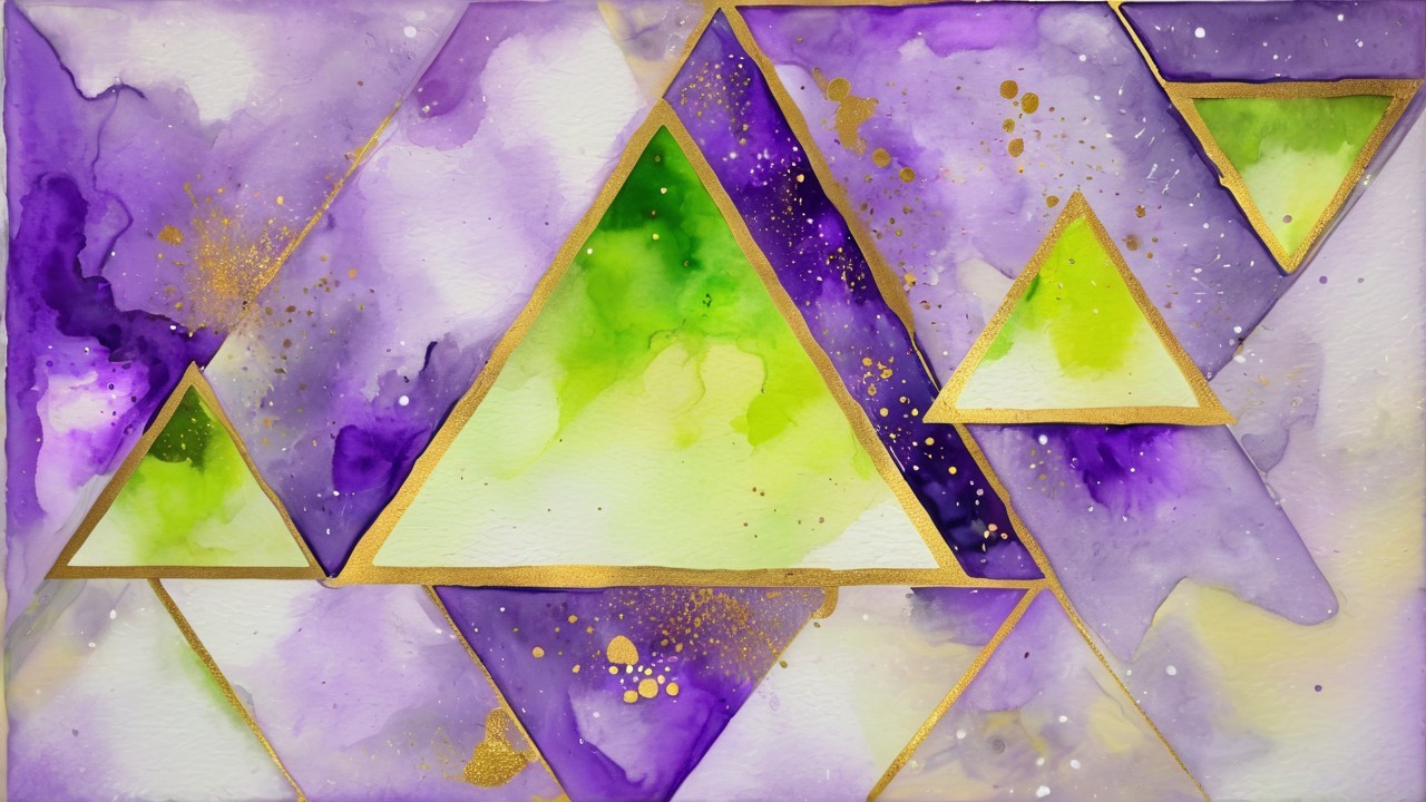 A vibrant abstract watercolor artwork featuring triangles in green hues set against a purple background, accented by golden lines and circles, creating a harmonious, dreamy effect.