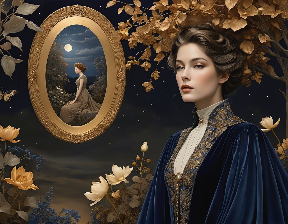 A young woman in an ornate blue gown gazes thoughtfully, surrounded by golden leaves and soft roses, while a moonlit landscape reflects in a decorative mirror behind her.