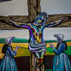 The image depicts a stylized crucifixion scene with a vibrant, abstract portrayal of Jesus on the cross, flanked by two women in traditional dress, engaged in prayer against a colorful landscape.