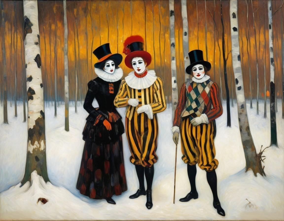 Three clowns in vibrant costumes strolling in a snowy forest with birch trees at evening.