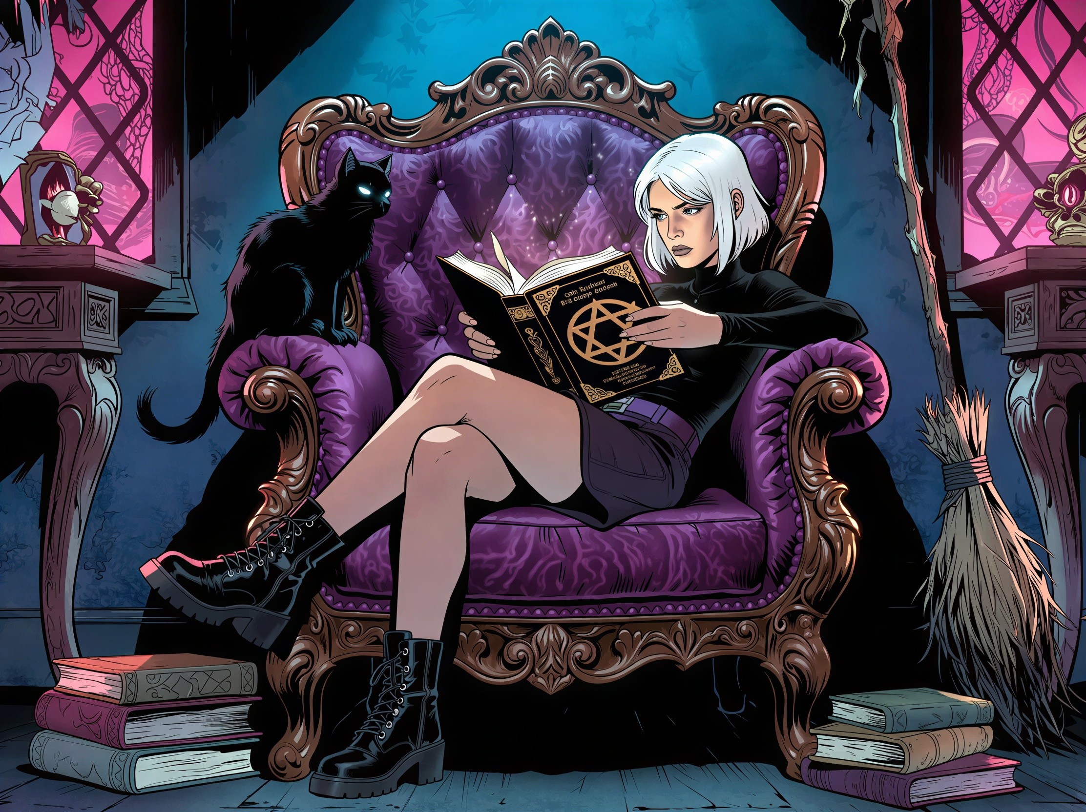 A woman with short white hair, black turtleneck, purple belt, and dark purple skirt sits in a large, ornate purple armchair, reading an open spellbook with a pentagram on the cover and glowing pages. She has her legs crossed, wearing black combat boots. A black cat with glowing blue eyes