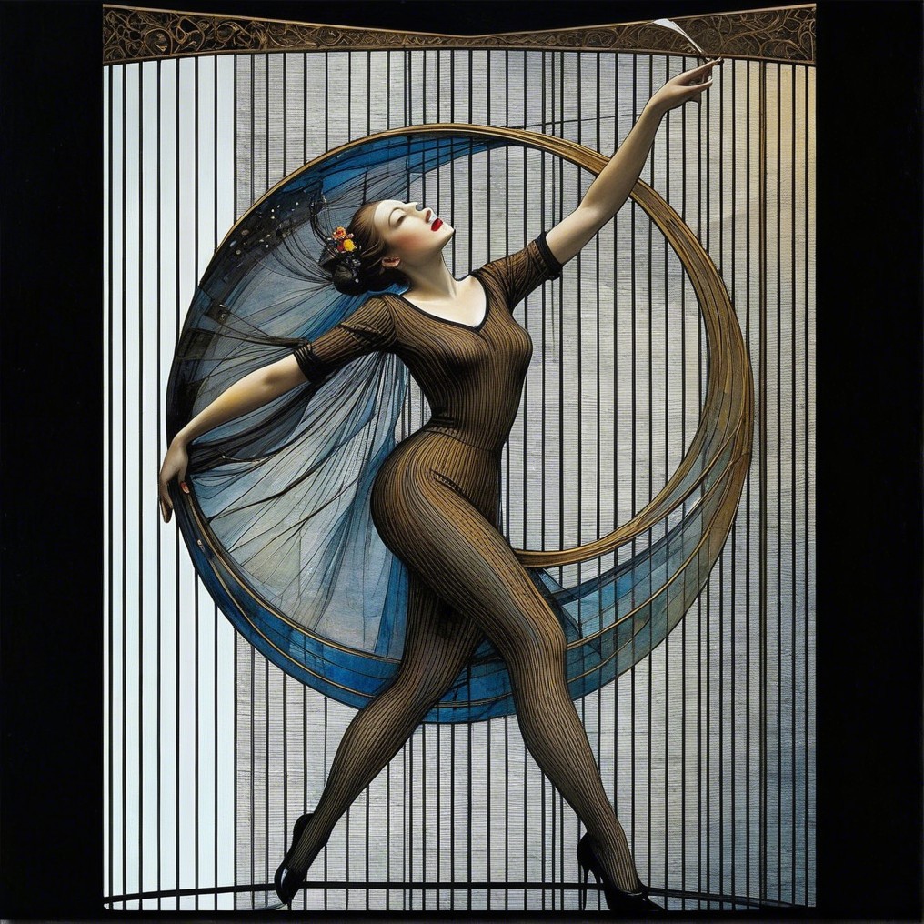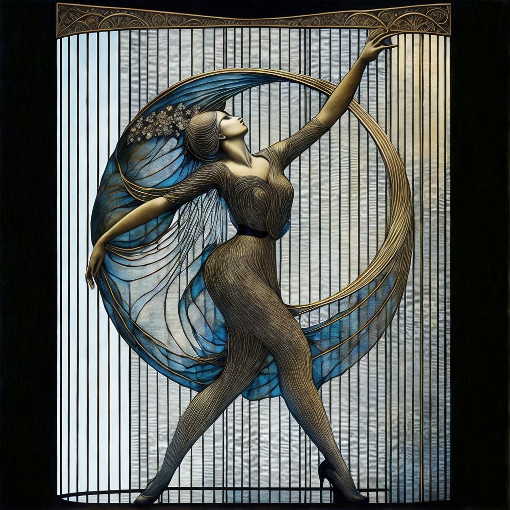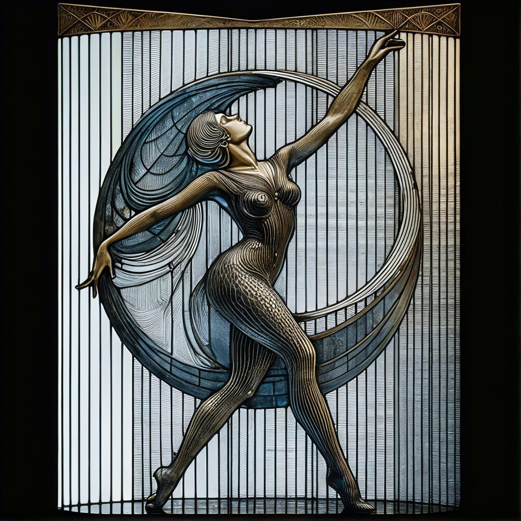 A stylized Art Deco portrait of a woman with a bob haircut, elegantly seated, holding a glowing orb. The artwork features swirling lines and a mix of metallic tones, exuding glamour and sophistication.