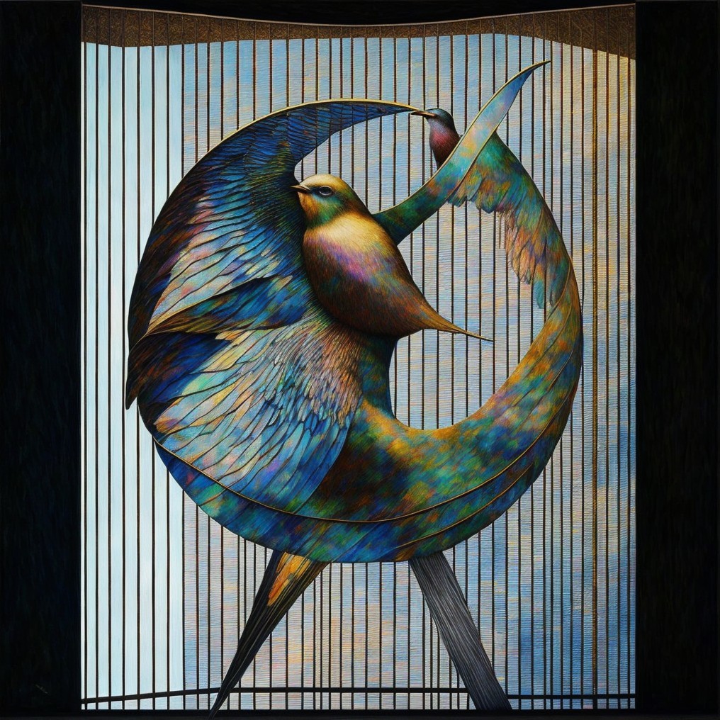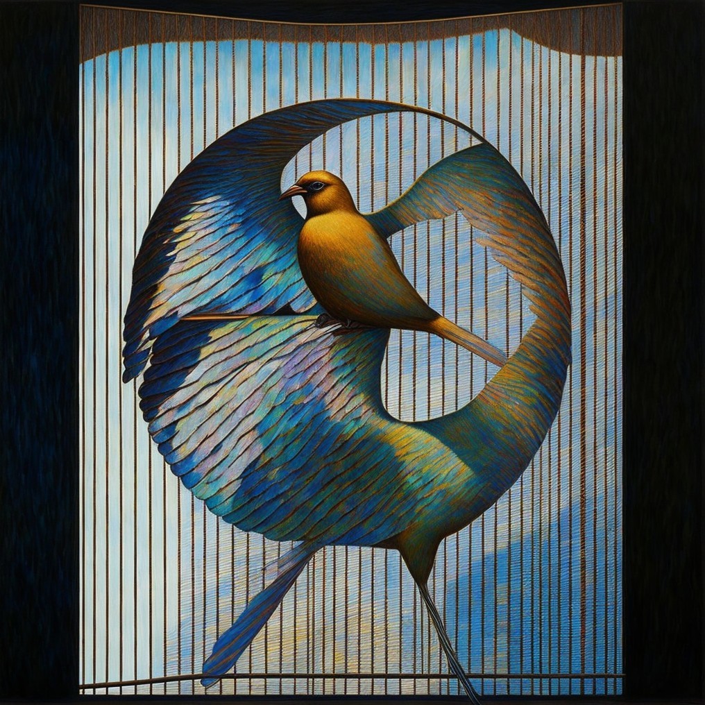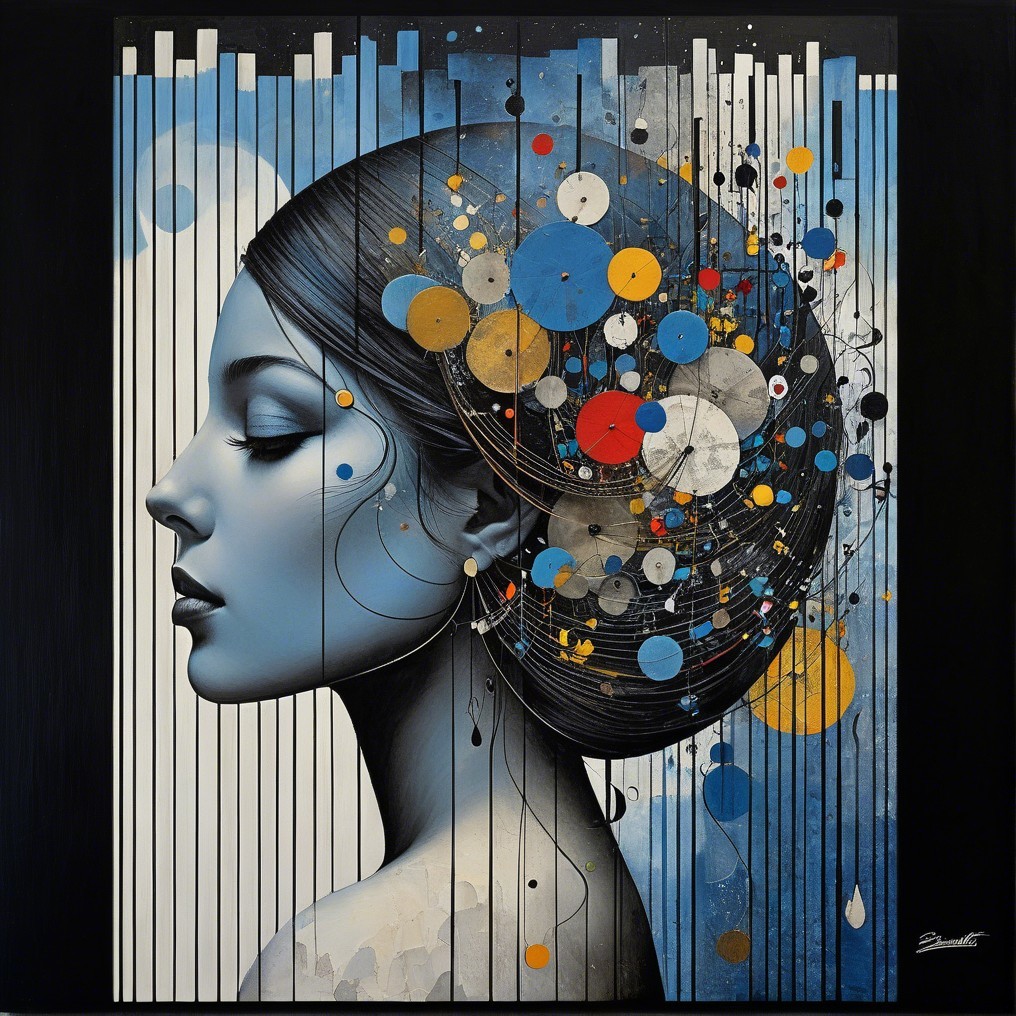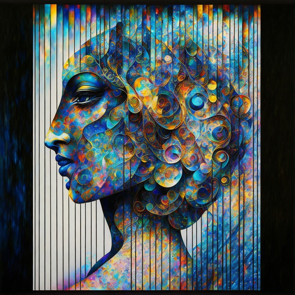 A stylized Art Deco portrait of a woman with a bob haircut, elegantly seated, holding a glowing orb. The artwork features swirling lines and a mix of metallic tones, exuding glamour and sophistication.