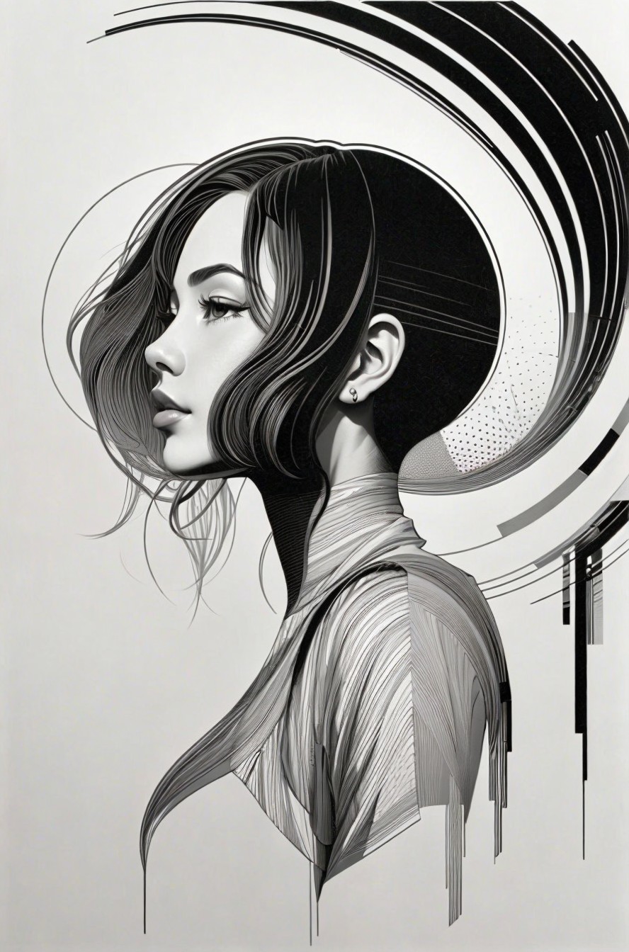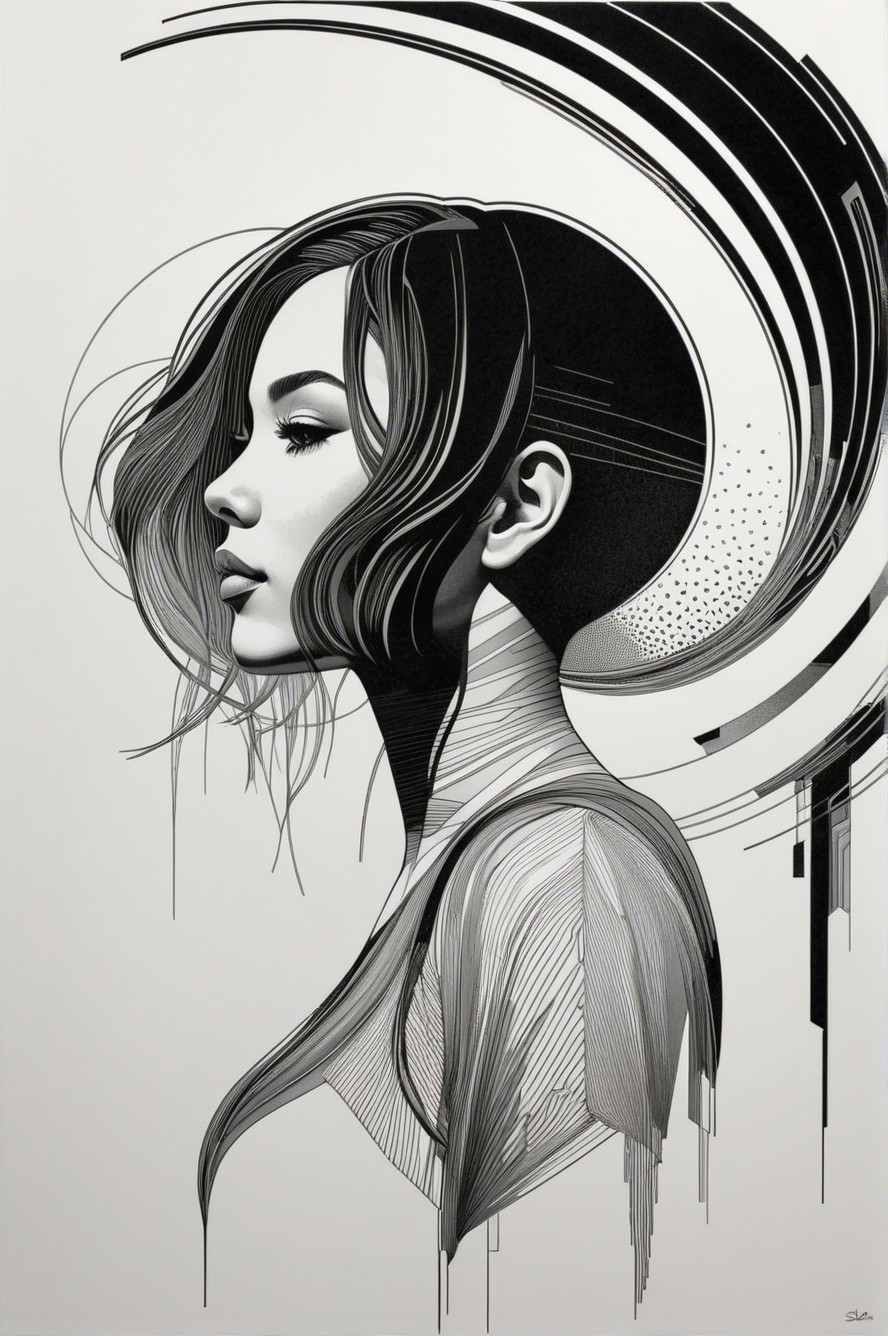 Line-art portrait in style of Amy Sol, merged coloring styles of Darren Waterston and Freda People, stylized female portrait, warm tones, line-art, retrofuturistic collagraphy print, geometrical linocut style, gradient coloring, contigous abstracted line-art, non-figurative, overexposed, brightness 1.6, mip-mapping 1.3, warped sketch-art details, dynamic lighting 1.8, kinetic, eerie, several catenaries, vortexes, swirls, fractals, only curves, perpendicular streamline_moderne, 3d effects, raytraced shadows, texture mapping, shadow mapping, displacement mapping, concept art, gradient coloring, overlay of gradient inking colors, layered vector art, negative lucas numbers, surreal 3d effects, polished, cel-shaded, baroque, hues by Ed Binkley, reflective mapping 1.4, liminal, dyed, folk-art, ambitious Shipibo-Conibo patterns merged with zentangle linework, line-art, very relaxed, generative patterns with soft edges, only curves and bended linework, quilling, hatchings, fantasy artwork with subtle visble watercolor textures, warm tones, high coloring, colorful wet-on-wet technique, simplistic, blotting quill pen used for embossed hues by Jackson Pollock, warm 3 point lighting, visible textures by Overton Loyd, hatching, sculpted, polished, quaint, ink and a scratching style, chiseled, plasticity 1.8, sgrafitto style, reflective mapping 1.3, liminal, surreal, anthropomorphized, anisotropic filtering 1.7, dynamic lighting 1.7, softened edges, cel-shaded, sculpted ensuring perfect symmetry and intricate visual cohorence, luminism, plasticity 1.6, dynamic lighting effects. Magical realism, weakening. slackening, hand-drawn style of reminiscent of Ed Binkley, embodiment by Ho Baron. Gothic-inspired woodblock print featuring a stylized portrait with a juvenile essence blending elements of Post-Avantgarde and pointillism, layered geometrical surrealism. estranged metallic paints, dappled glow, line-art concept, whimsical retro fusion,