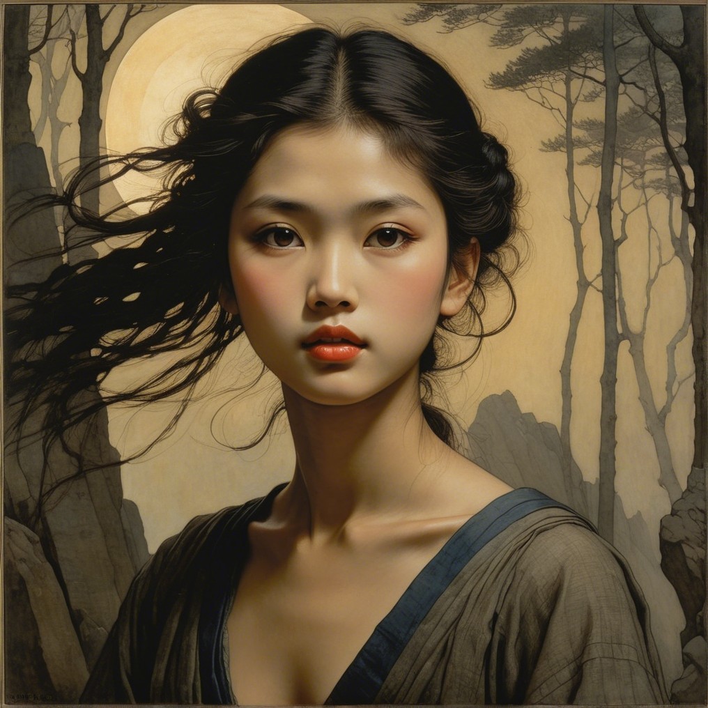 The image depicts a dramatic scene of figures in traditional attire on a cliff, with one person hanging off the edge while others watch. The setting features mystical mountains and serene trees.