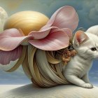 A whimsical scene featuring a giant white cat beside a cliff adorned with a house and a pink shell. In the background, colorful planets float in a serene sky, creating a dreamy atmosphere.