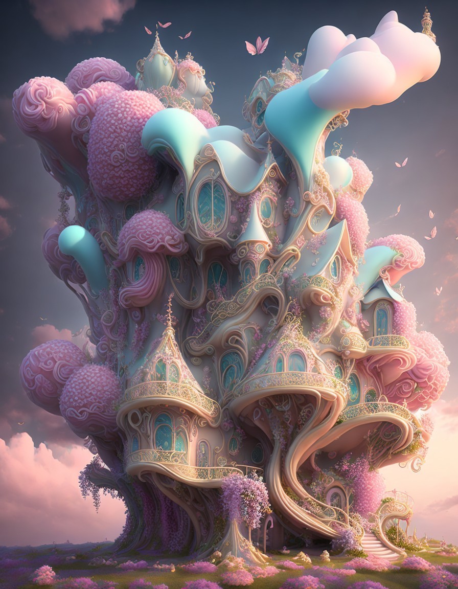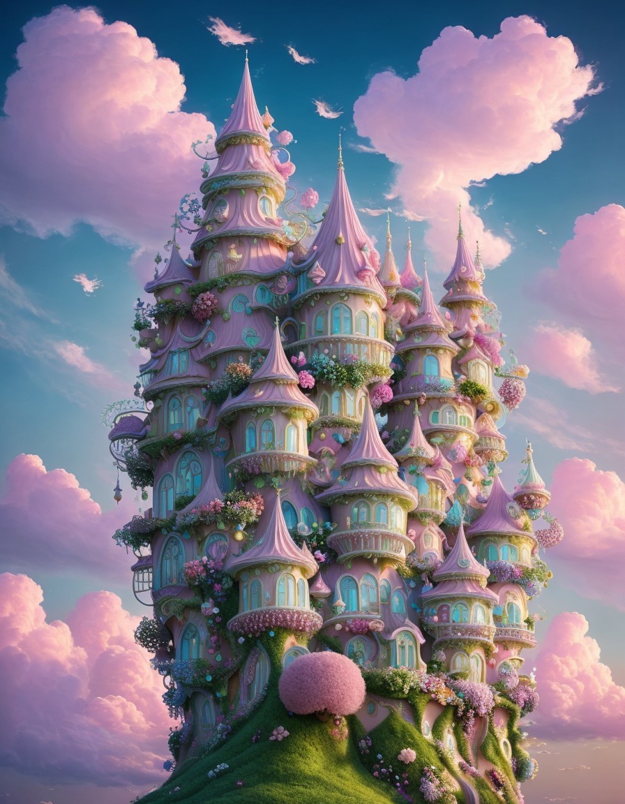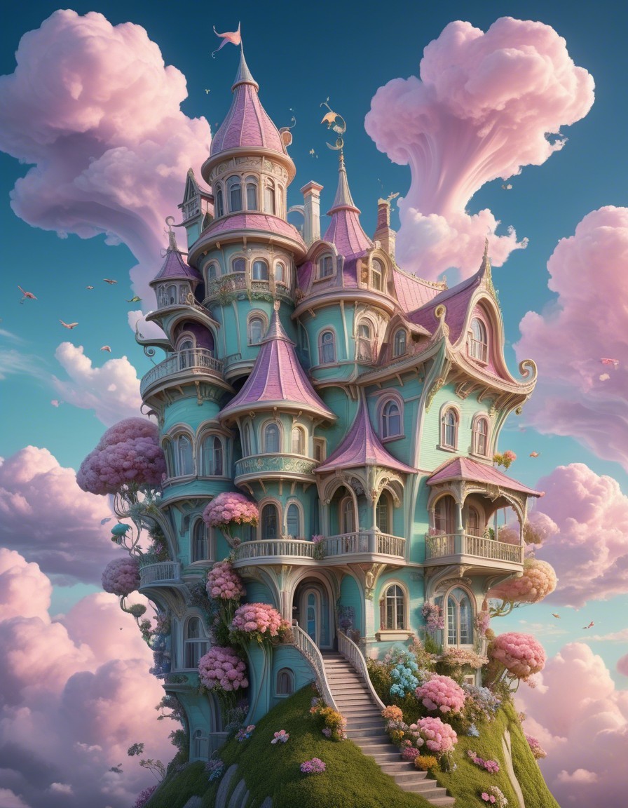 A whimsical, fairy-tale castle rises among fluffy pink clouds. Its colorful towers and spiraled roofs create a magical aura, adorned with flowers and surrounded by dreamy pastel skies.