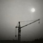 A silhouetted construction crane stands against a moody sky, with a bright full moon glowing above, creating a striking contrast in this atmospheric, monochromatic scene.