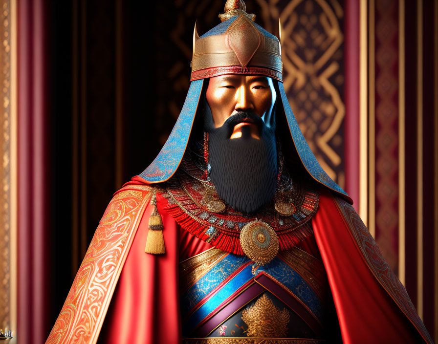 Regal Ancient Chinese Warrior in Ornate Armor with Long Black Beard