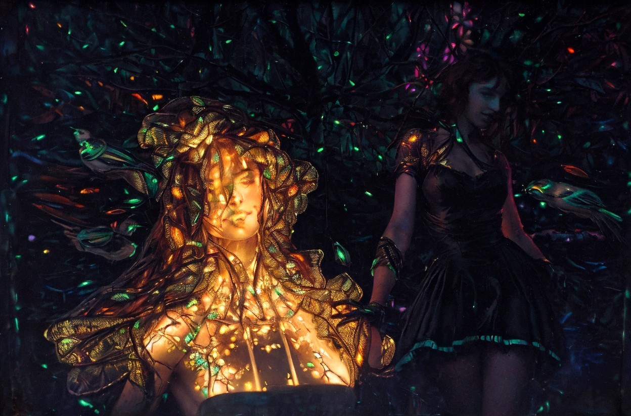 Beautiful Woman wrapped in neon lights, standing under a tree constructed of birds.