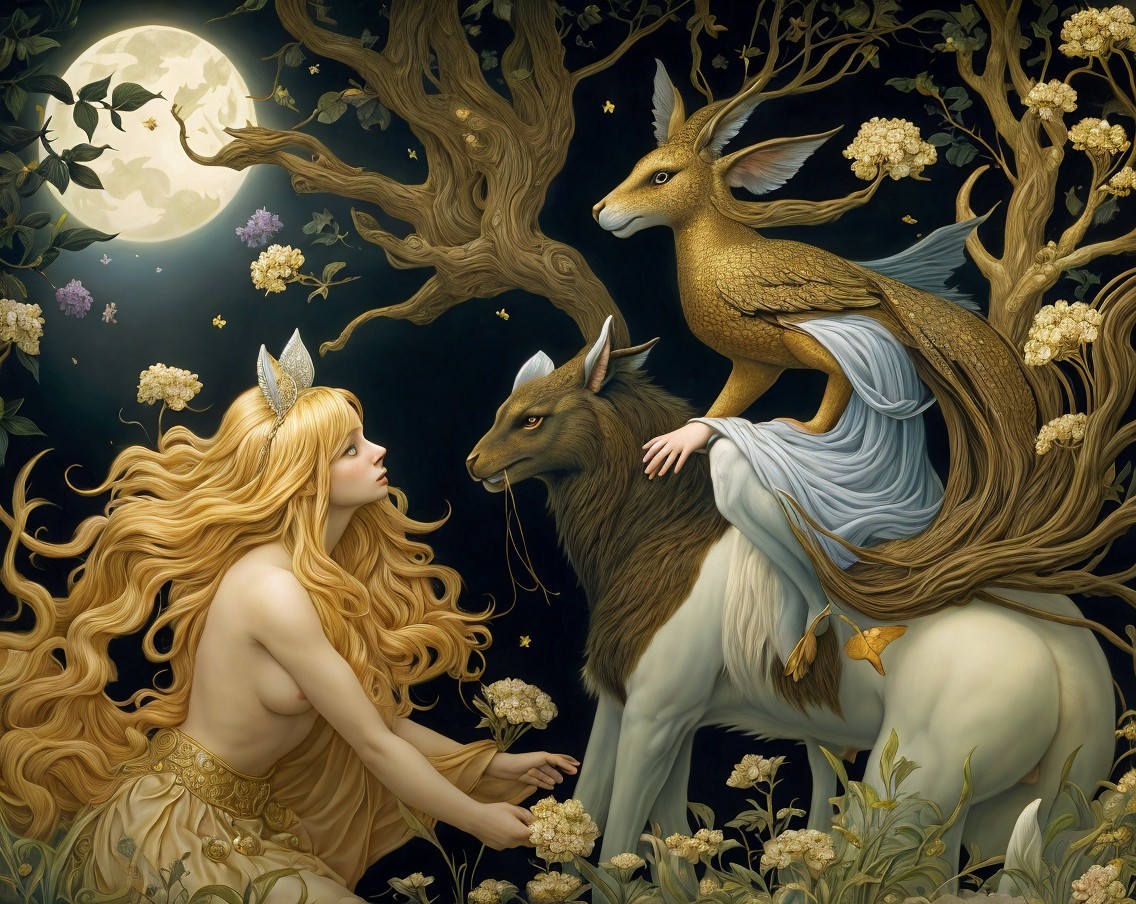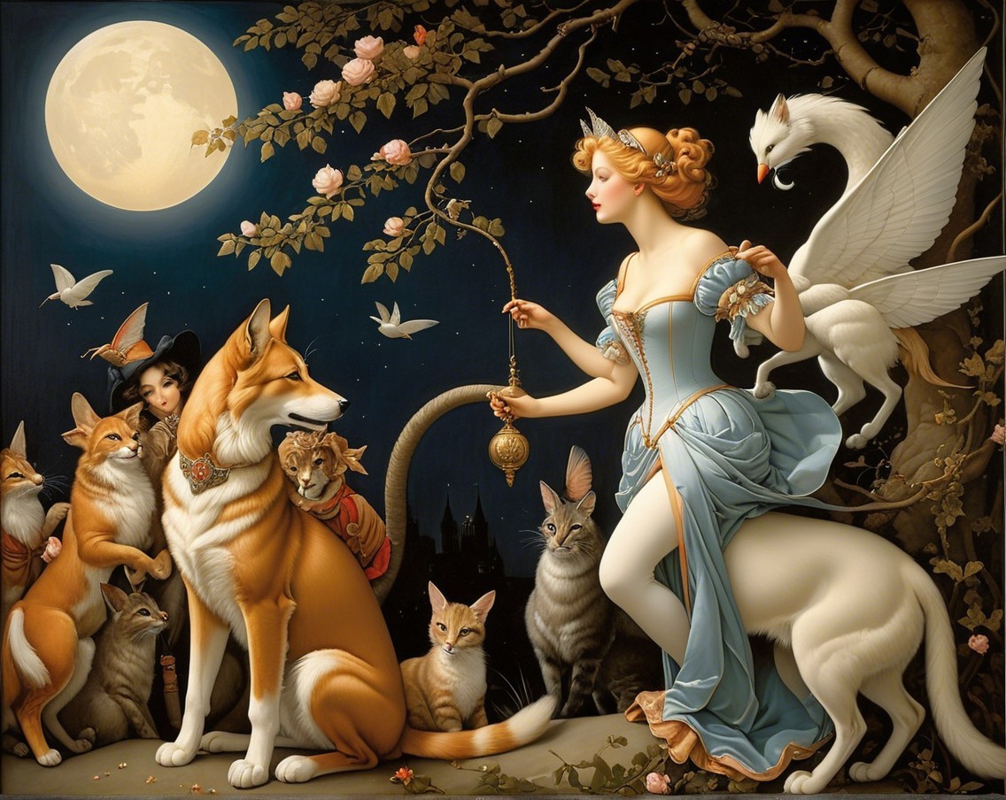 A fairy with red hair and a blue gown sits beside a regal lion, adorned with a red cape, under a glowing moon. She holds a wand, surrounded by autumn leaves, creating a whimsical scene.