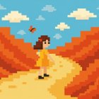 A winding dirt road stretches through tall, golden grass on either side, leading towards a distant hill under a bright blue sky dotted with fluffy clouds.