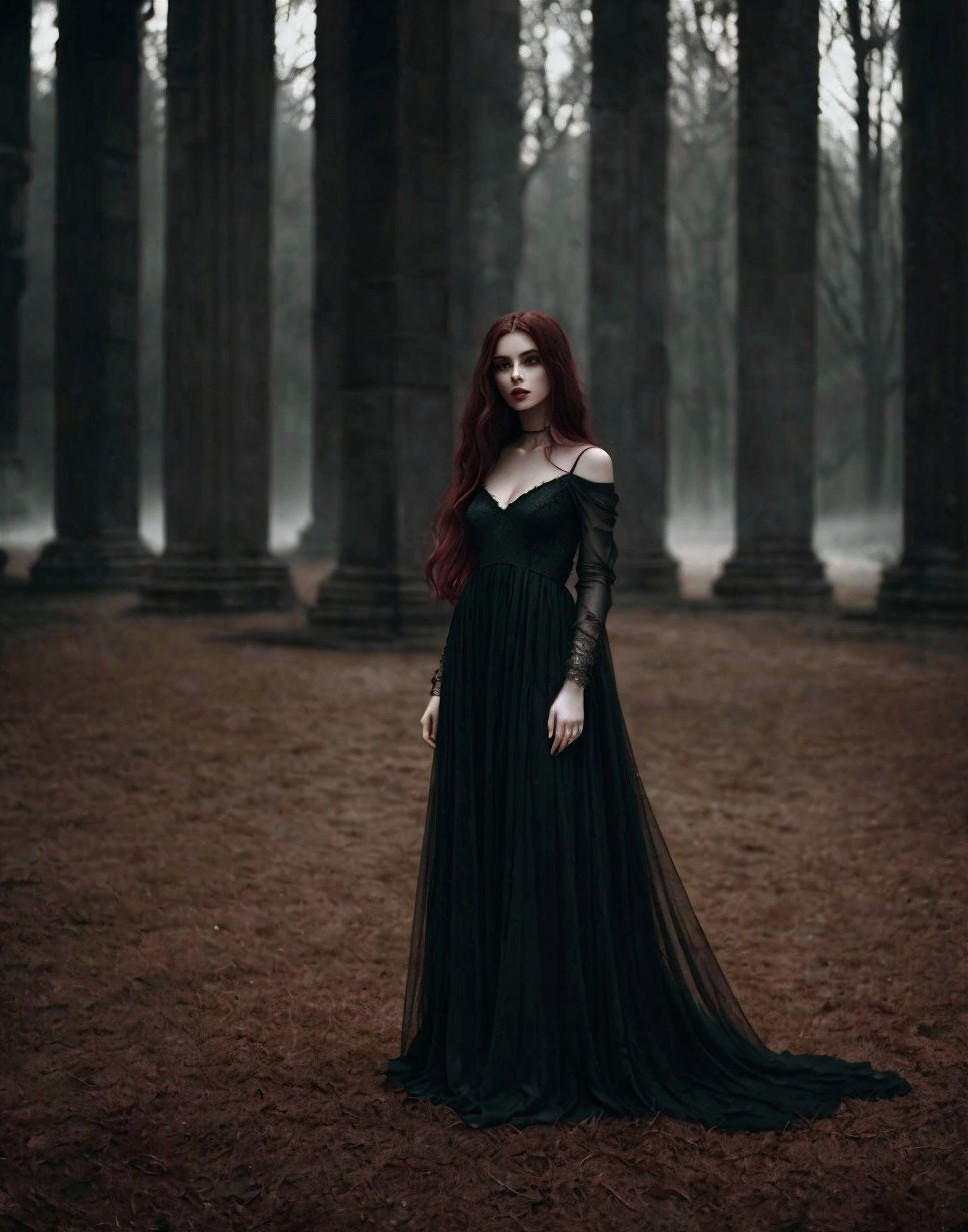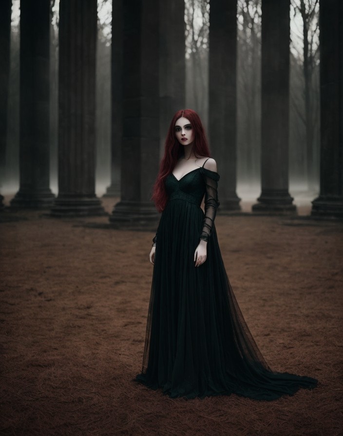 Prompt: ""Identity Crisis" {dystopian dark Fantasy}[Photograph of a girl in "scarlet space"]{eerie ambiance, dark and withe hues with soft shadows, vintage retro flair, surrealistic vibe, delicate features, flowing attire, serene expression, ancient architecture, lush greenery, blurred background, surreal splash art, pale translucent skin, hi-res, photorealistic (Nikon Z9, 85mm F1.2, DOF, smooth and realistic HDR, static composition) with a touch of cyberpunk aesthetic, high definition detail, enchanting ambiance, Ultra-realistic portrayal, sharp focus, cinematic lighting}"