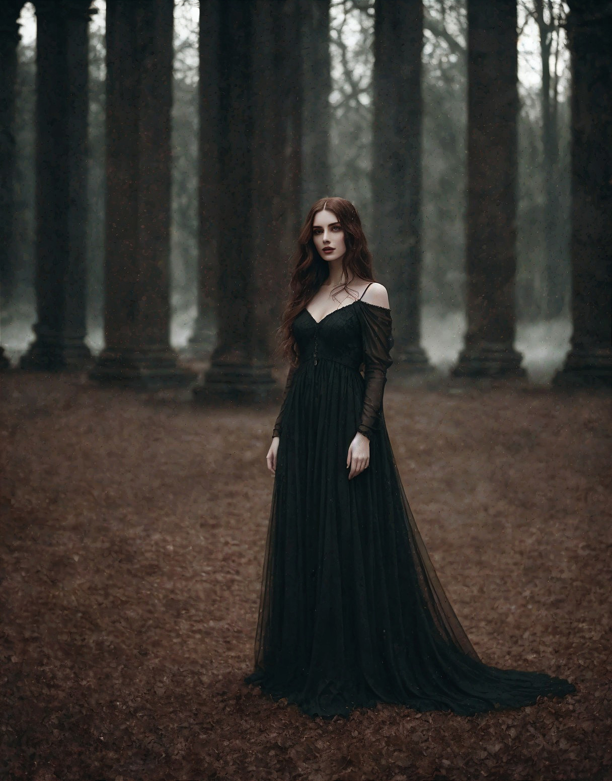 A young woman in a flowing, dark green gown stands amidst ancient, vine-covered pillars in a misty forest, exuding an ethereal beauty and a sense of mystery.