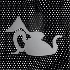 A striking black and white image featuring a silhouetted teapot with an unusual horn attachment. The background is dotted with small white squares, creating a dynamic visual effect.